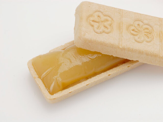 完熟南高梅のピューレを白餡に練りこんだ、梅の酸味がほどよい最中です。食べる直前に皮と合わせて、サクサクとした食感とともに味わえます。