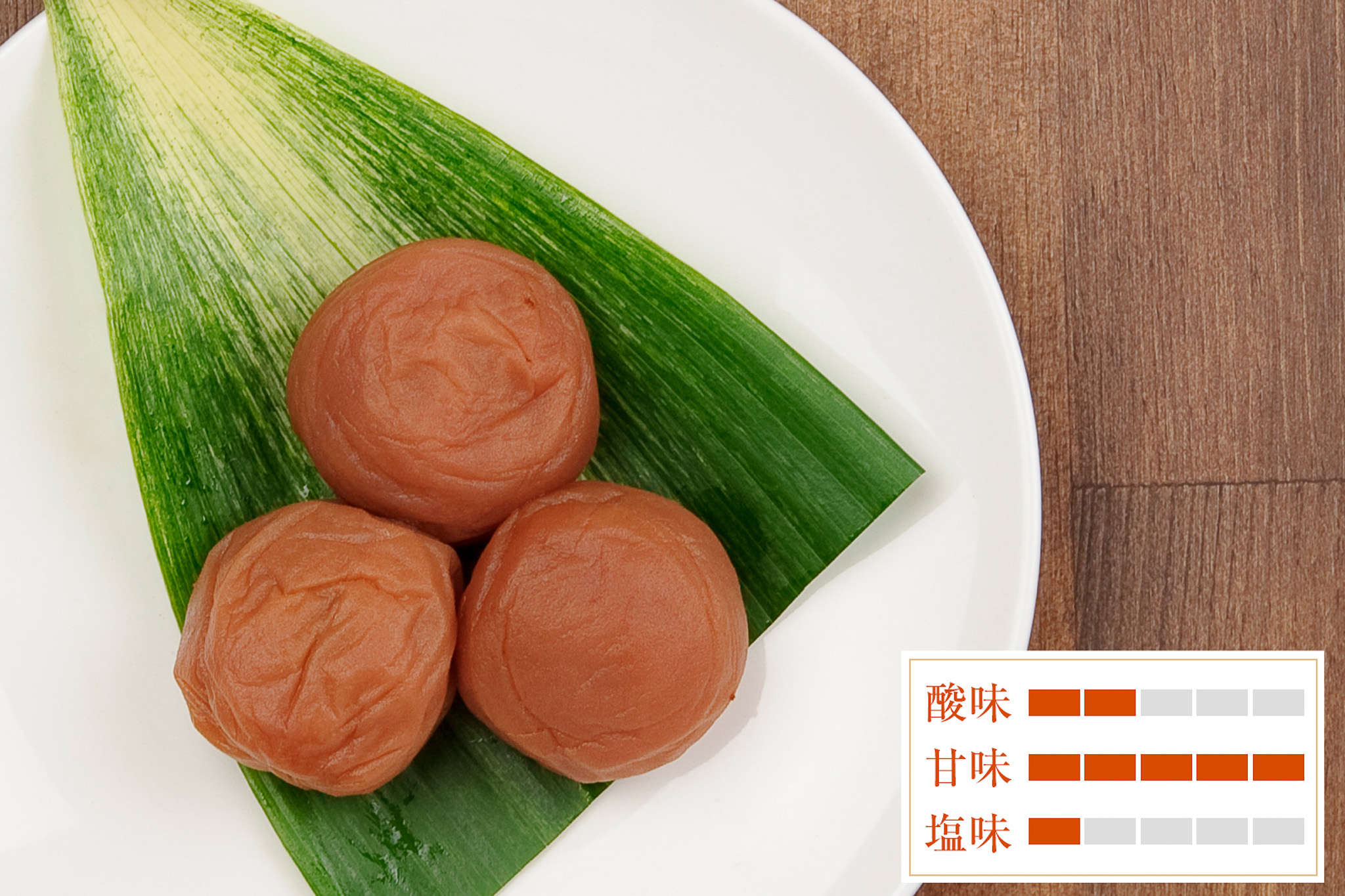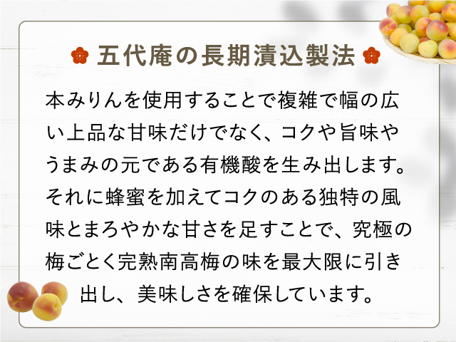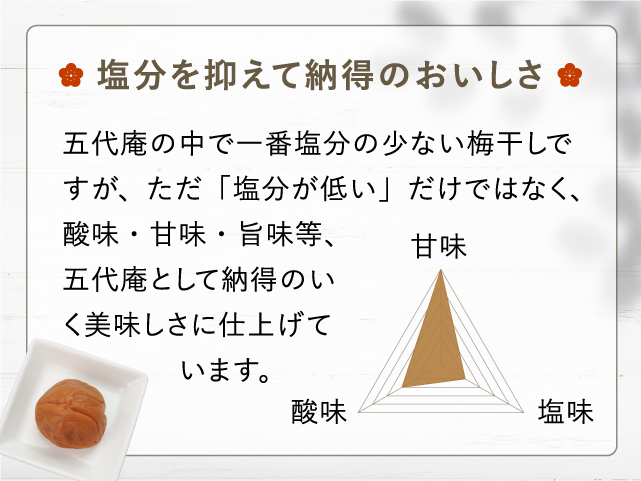 塩分を押さえながらも、紀州南高梅の美味しさは損なわず。五代庵の中で一番塩分の少ない梅干しですが、ただ「塩分が低い」だけではなく、酸味・甘味・旨味等、五代庵として納得のいく美味しさに仕上げています。