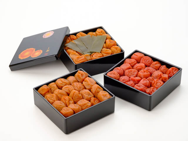 紀州五代梅、しそ漬、こんぶ梅の3種を五代庵オリジナル黒江漆器で詰め合わせました。